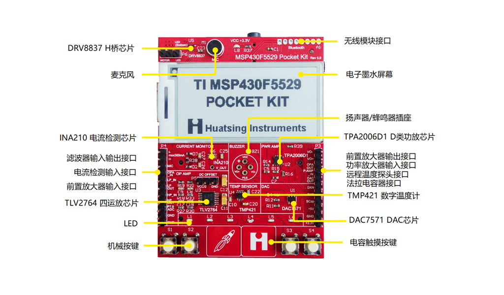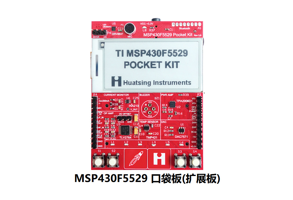 MSP430F5529口袋板套件由核心板與擴展板兩部分組成。核心板為TI MSP430F5529 LaunchPad,擴展板集成了電子墨水屏、電流檢測芯片、低壓H橋驅(qū)動器、四路集成運放、D類功率放大器、串行DAC、雙溫區(qū)數(shù)字溫度傳感器等眾多新型模塊及器件。MSP430F5529 口袋板套件可以作為MSP430單片機、微機接口等課程實驗平臺使用,也可以作為各級電賽及科技創(chuàng)新平臺使用。